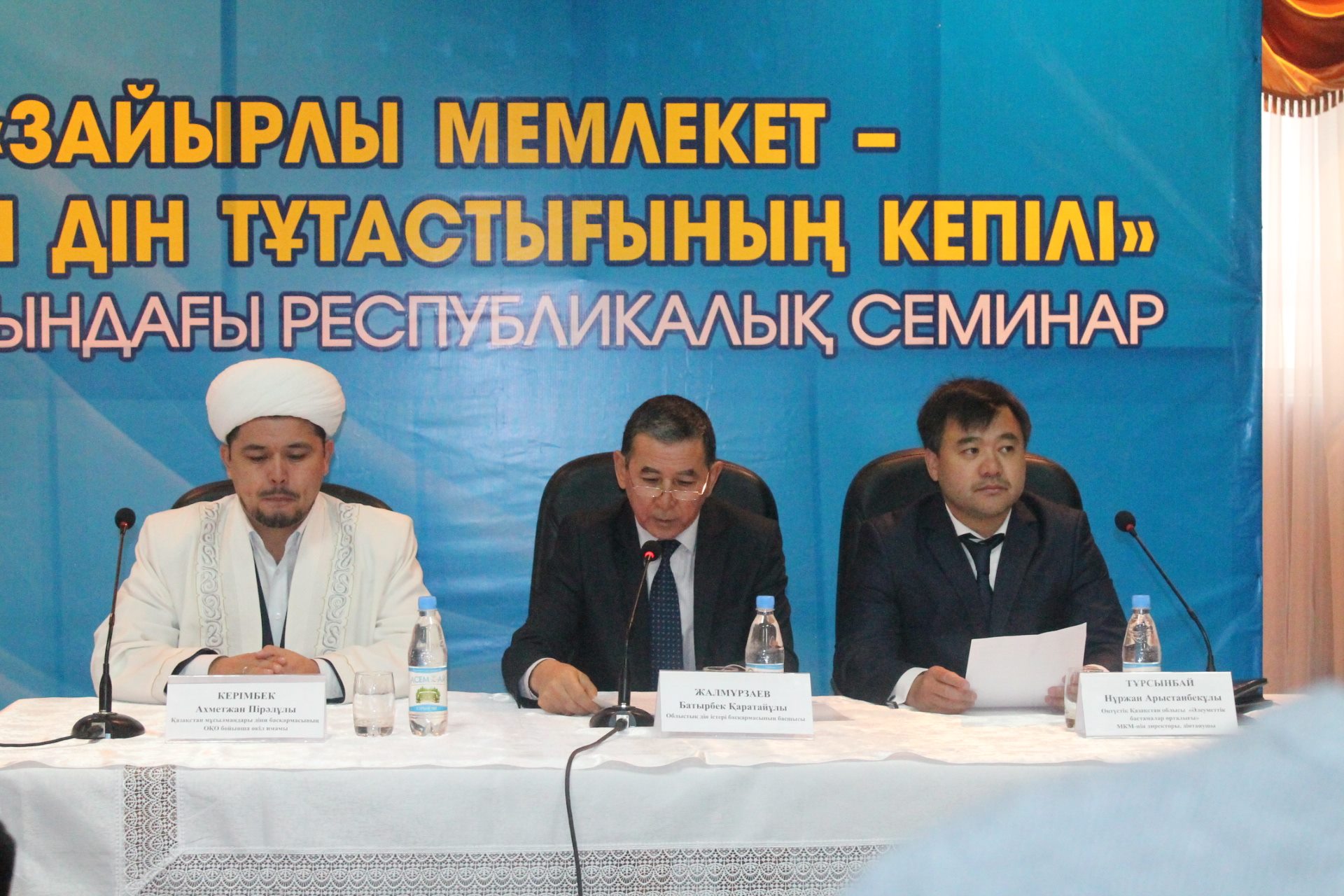 Семинар барысында Қазақстан мұсылмандары діни басқармасының Оңтүстік Қазақстан облысы бойынша өкіл имамы Ахметжан қажы Керімбек «Дәстүрлі діндердің қоғамдағы рөлі» тақырыбында баяндама жасады. Баяндамада дінаралық келісім мен ұлтаралық татулықты сақтау мәселелері, оңтүстік өңіріндегі мешіттердегі ахуал, деструктивті діни ағымдардың алдын алу бойынша бірлескен жұмыстардың жүзеге асырылу жайы, дін қызметкерлерінің біліктіліктерін көтеру, т.б. көптеген мәселелер әңгімеге арқау болды.