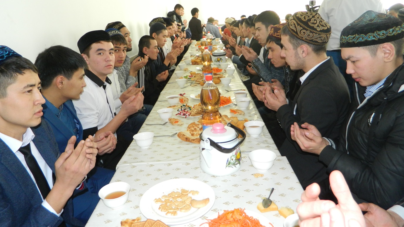Ас соңнан қарилар қасиетті Құран сүрелерінен оқып, Пайғанбарымыз Мұхаммедке (Оған Алланың игілігі мен сәлемі болсын) және дүниеден озған барша ата-бабаларымызға сауабы бағышталды.