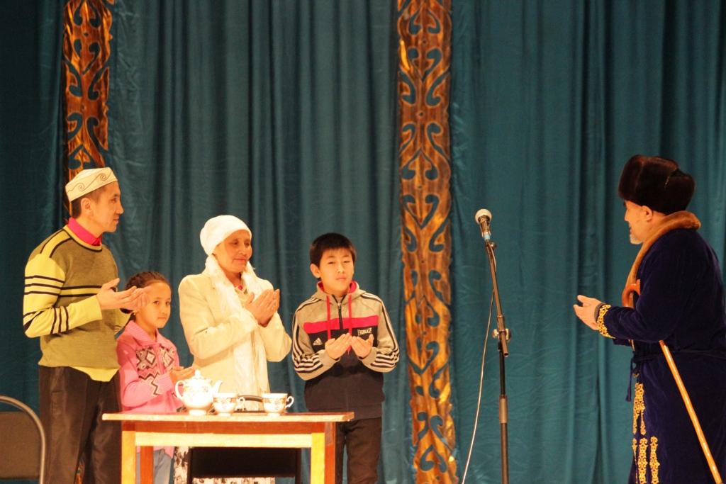Жиналған көпшілікті аудан әкімі Қуандық Хайдарұлы құттықтаса, мешітіміздің бас имамы Дәргерхан Тұрдыақынұлы Пайғамбарымыздың (с.ғ.с) өмірбаянына тоқталып, насихат айтты. Кеш барысында жүрек тебірентер әндер орындалып, тағылымы мол сахыналық көрністер көрсетілді. Сондай-ақ мән мағынаға толы көріністердің бірі аудандық мешіт намазхандары қойған көрніс «Қарттар үйі». Бұл әрине әр қазақтың жүрегін сыздатқан бүгінгі қоғамның бір індеті. Мешіт намазхандары бұл көрніс арқылы оқырманға ой сала отырып, көздеріне жас алдырды. «Хан сарайына» лайық жандардың қарттар үйіне қамалып, сағыныш сарсаңға салған аянышты тағдыры кім-кімді де ойландырмай, толғандармай қоймасы анық.
