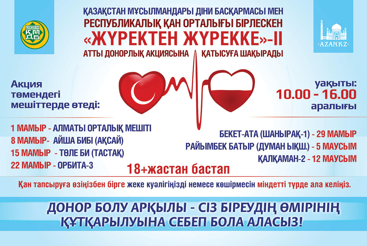 Өкінішке орай, бүгінде донорлардың жетіспеушілігі алаңдатады. Осыған орай Қазақстан мұсылмандары діни басқармасы Республикалық қан орталығымен бірлесе отырып үстіміздегі жылдың мамыр-маусым айларында "Жүректен жүрекке" атты қан беру қайырымдылық акциясын ұйымдастыруда. Шараның мақсаты қала халқы мен мешіт жамағатының қанға мұқтаж адамдарға қол ұшын беруіне ұйытқы болу.