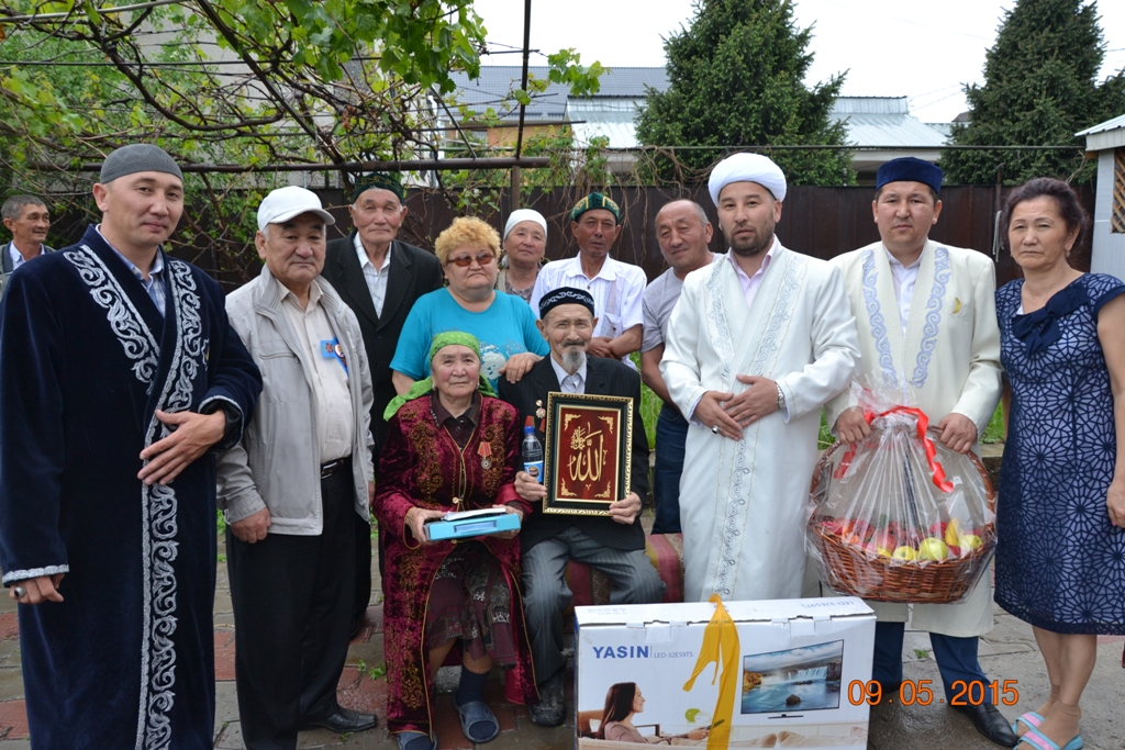 Осы жеңіс күні мерекесіне орай ҚМДБ-ның филиалы Таугүл-3 мешітінің бас имамы Нұржан Таласұлы өз ұжымымен бірге қазыналы қартқа сәлем бере барып, Бас мүфти Ержан қажы Малғажыұлының атынан батыр атамызды мерекесімен құттықтады. Осы кездесуде, имам соғыстың сұрапыл тарихын жаужүрек атамыздың өз аузынан естіп, қартқа құрмет көрсетіп, мешіт тарапынан теледидар мен діни заттар электронды жайнамаз, ораза туралы кітап, тақия, зәмзәм суы және т.б. сыйлықтар ұсынып, қарттың ақ батасын алды.