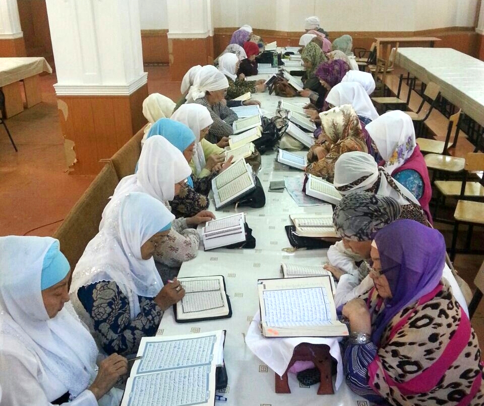 Алматы қаласы Бостандық ауданының орталық «Орбита» мешітіндегі сауат ашу курсында дәріс тыңдайтын апа-әжелер де қасиетті Рамазан айында Құран хатым етуде.