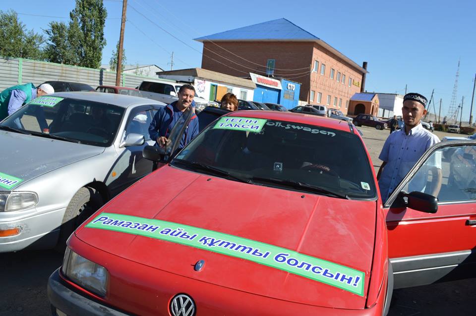 Жексенбі күні, ел бір күнгі демалысында «Жақсылық» базарына барып, азық – түліктерін, керек — жарақтарын қамтамасыз етіп қалатын кез. Келушілер базардың кіре берісінде «Рамазан айы құрметіне, тегін такси» — деген жазуы бар, сап түзеген он үш жеңіл автокөліктерге таңдана да, таңырқай қарады. «Мешіт» — деген жазуы бар жасыл жекет киген жігіттер ел қолындағы жүктерін көтерісіп, көліктерге отырғызып жатты. Мешіт имамы Думан Нәдірұлы: «Бұндай ізгі шаралар алдағы діни мерекелерде жалғасын таппақ» — деп өз тілегін білдірді. Осындай жақсы іске куә болған ел арасында «такси апа» аталып кеткен, ақсамайлы Оразхан Есбайқызыда жастар ісіне разы болып, «тегін такси» ісіне бел шеше кірісіп кетті.