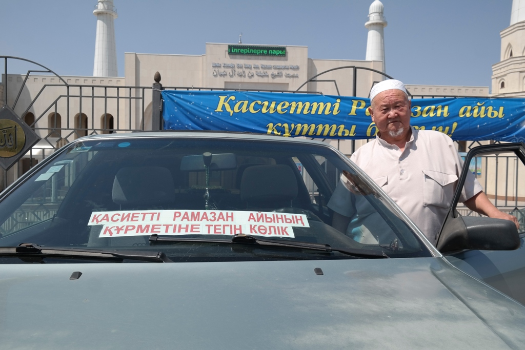 Қасиетті Рамазан айының алғашқы күнінен бастап Шымкент қаласында орналасқан «Тасбау Сәлімбай» мешітінің азаншысы Болат Нұрманов өзінің жеңіл авто көлегімен әр күні түске дейін қала тұрғындарын тегін тасмалдауда.
