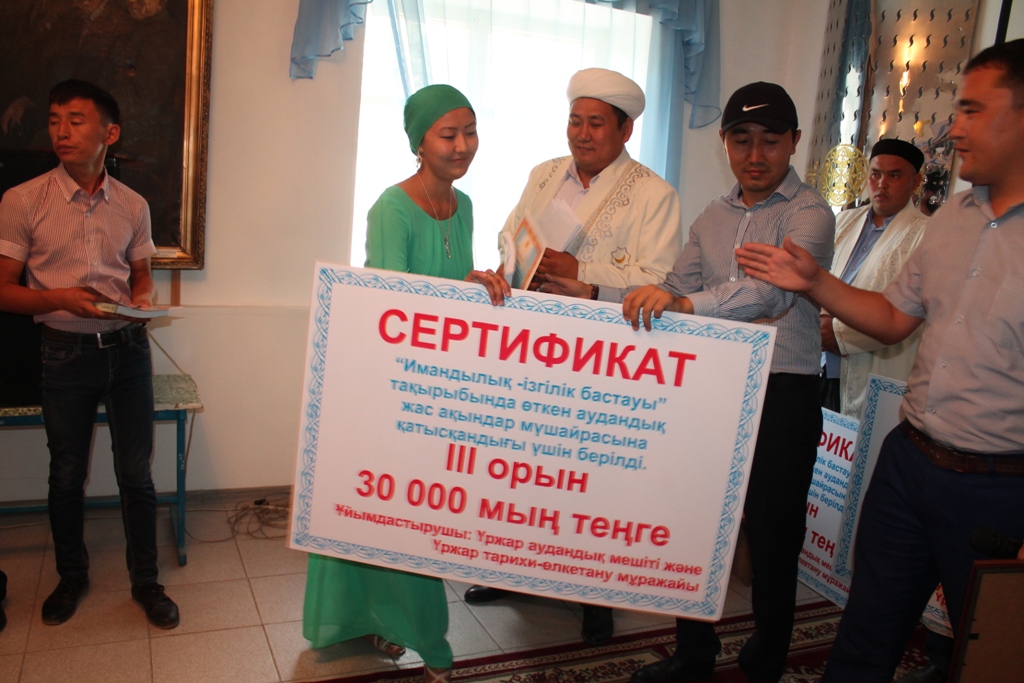 Жүлделі орын иегерлері Үржар ауданының әкімі Серік Зайнулдиннің арнай дипломы мен және үшінші орын иегерлері Абай ОМ Мұғалімі Гүльнур Келгенбаева, Мақаншы ауылынан Қымбат Төлепбаева- 30 000 тенге ақшалай сыйақы. II-орын иегері Бестерек ауылынан Шалқар Қаратаев 50 000 тенге мен марапатталды. Осы ізгі істің бастаушысы және ұйымдастырушысы Аудандық мешіттің бас имамы Нұрзат Қасымұлы I-орын иегерін яғни жүзден жүйрік,мыңнан тұлпар, поэзялық іліміменен, поэзясының жана формасымен ерекшеленген Асқар Бейсенғазы 70 000 тенге ақшалай сыйақы мен марапаттап, меккеден келген кітап табыс етті.