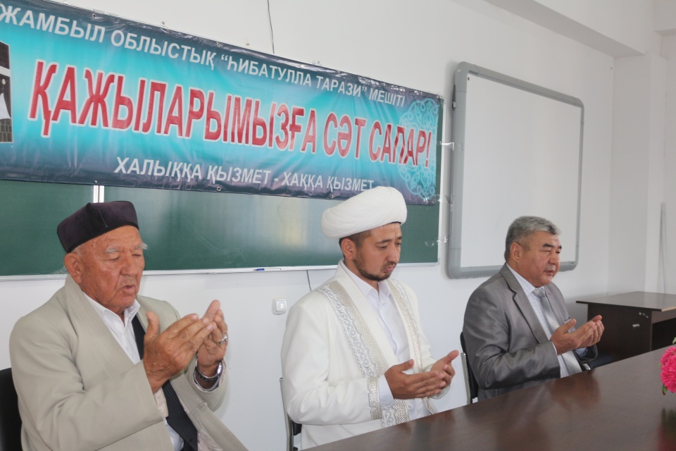 Бүгін «Һибатулла Тарази» мешітіне жиналғандарға бас имам Данияр қажы Жұмабаев пен Жамбыл облысы әкімдігінің дін істері басқармасының басшысы Жангелді Омаров дұға етіп, ұзақ жол жүруге дайын жамағатқа ақ жол тіледі. Құран оқылып, қариялар ақ батасын берді. Күндердің ұлығы жұма күні таңертең Алматыға ат басын бұрған қажылар ертең тікелей Мәдина қаласына 6 сағат бойы «Flynas» әуе компаниясымен аттанбақ.