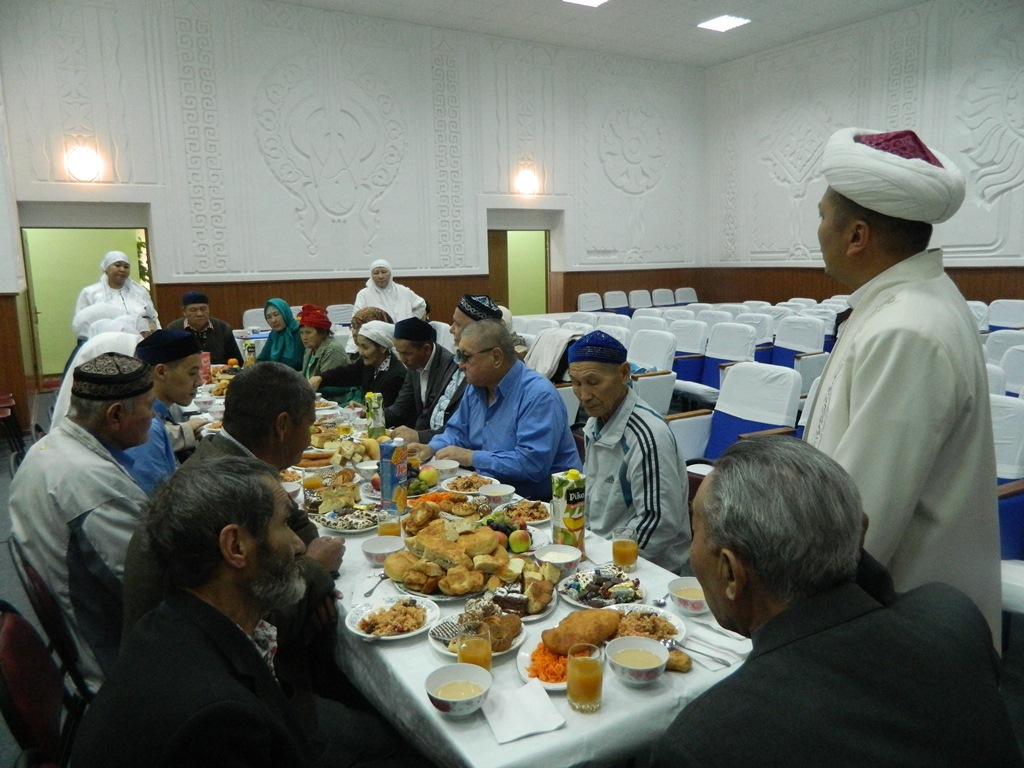 Кең залға жайылған дастарханда қариялармен бірге шәй ішіп, әңгімелескен қажылар олардың көңілдерін аулап, мұңдарын тыңдады. Қариялар өздерінің дін туралы білгісі келген сауалдарын қойып, оған өкіл имам С.Сейтбеков жауап берді. Сондай ақ, бас имам қажылық, тағдырға иман келтіру жайында уағыз айтты.