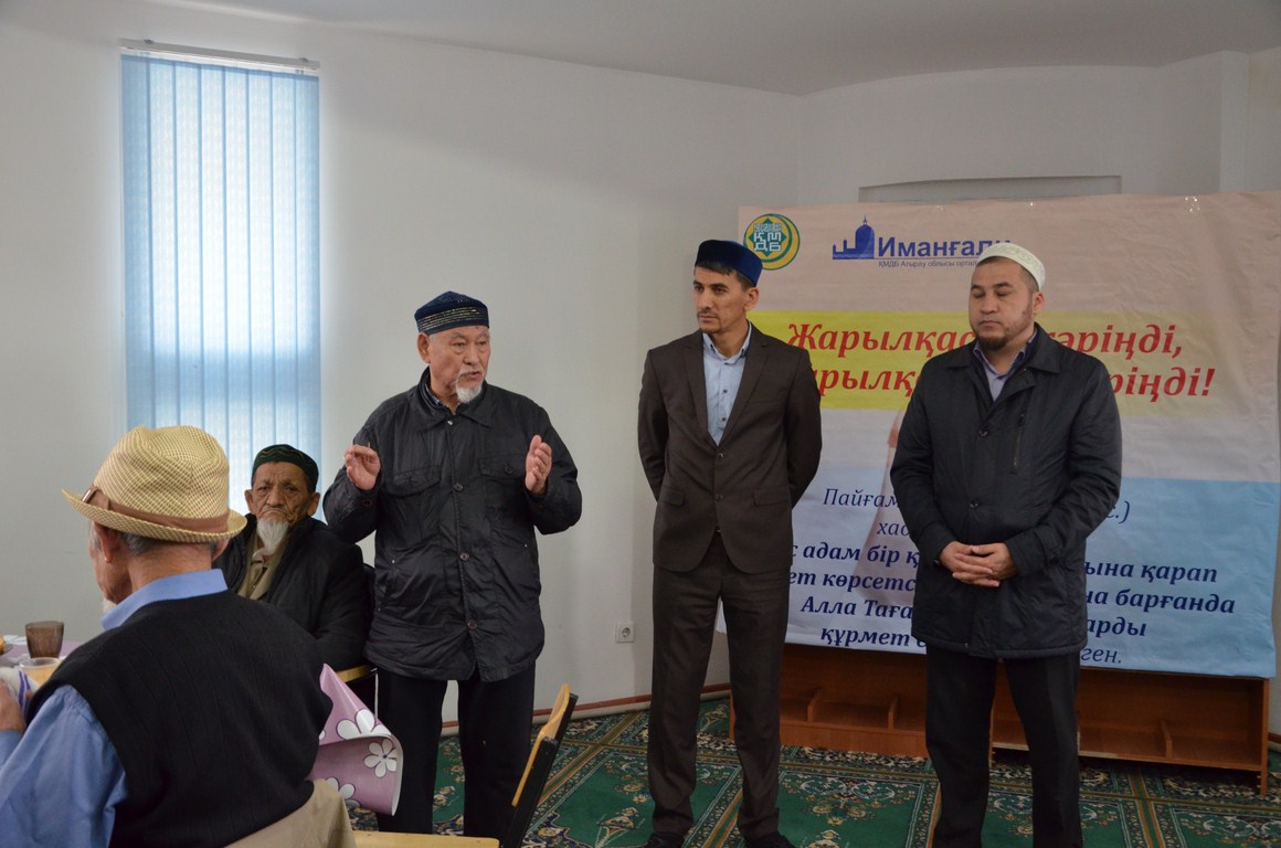 "Иманғали" орталық мешітінің Бас имамы Батыржан Берденұлы дастархан басына жиналған қарияларды қасиетті жұма күнімен құттықтап, ауыздарынан Алласы, қолдарынан таспихы түспейтін, немере-шөберелеріне өнеге көрсетіп келе жатырған аталарымызға денсаулық пен мол иман тіледі. Сонымен қатар үлкендердің құрметіне жайылған дастарханның қонағы болған республикалық ақпараттық насихаттық тобының мүшесі, теолог Бақытбек Тәжімбетқарияларымызға уағыз насихат айтып, екі дүниенің бақытымен, ризығын тіледі. Үлкендер жағы Бас имам Батыржан Берденұлы бастаған мешіт ұжымына алғыстарын білдіріп, осындай өнегелі отырыстардың әлі де жалғас беруін тіледі.