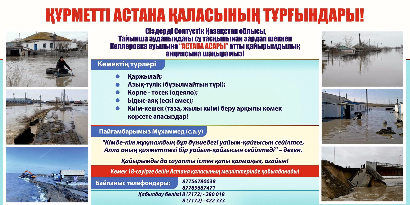 Қазақстан мұсылмандары діни басқармасының бастамасымен Солтүстік Қазақстан облысының Тайынша ауданындағы көктемгі су тасқынынан зардап шеккен Келлеровка ауылына көмек көрсету мақсатында «Астана асары» атты қайырымдылық акциясы ұйымдастырылады.