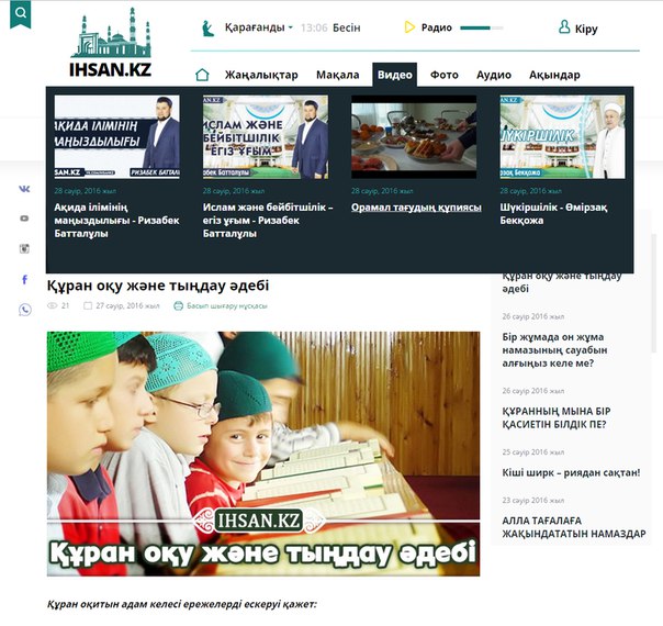 2009 жылдан бері ақпараттық-насихат жұмысын бастаған сайт бүгінгі таңда ғаламтор оқырмандары арасында ерекше сұранысқа ие, қаралым көрсеткіші де арта түскен. Республикалық 7000 сайт арасында 300-400 -ші орын аралығында тұрған сайт қазіргі күні 104-ші орынға табан тіреді. Алайда, қол жеткізген бұл нәтижемен ihsan.kz сайты тоқталып қалмай, әрі қарай даму үстінде. «Ақида», «Ислам ғұламалары», «Өнеге», «Ислам және жанұя», «Тағылымды тарих», «Рамазан» секілді айдарлар әрдайым жаңартылып, сайттың оқырманға ұсынар жаңалықтары арта түсуде. Видео бөлімінде халыққа ұсынылатын апталық жұма уағыздарынан бөлек мешіт бастамасымен түсірілген өнегелі шағын видеороликтер аз уақыт ішінде көрермен көзайымына айналып үлгерді.Сондай-ақ, сайтымыздағы радиодан көпшілік қасиетті Құран аяттарынан үзінді тыңдап, сайт бетіндегі тест тапсырмасына жауап беру арқылы ілімін толықтырып отыра алады. Жаңаша түрленіп, жаңартылған үлгіде жарыққа шыққан сайтымыздың жаңа нұсқасы бұдан кейін де көпшілік көңілінен шығады деген үміттеміз! Ғаламтор желісінде өзіндік орны қалыптасқан ihsan.kz cайтымен бірге болыңыздар!