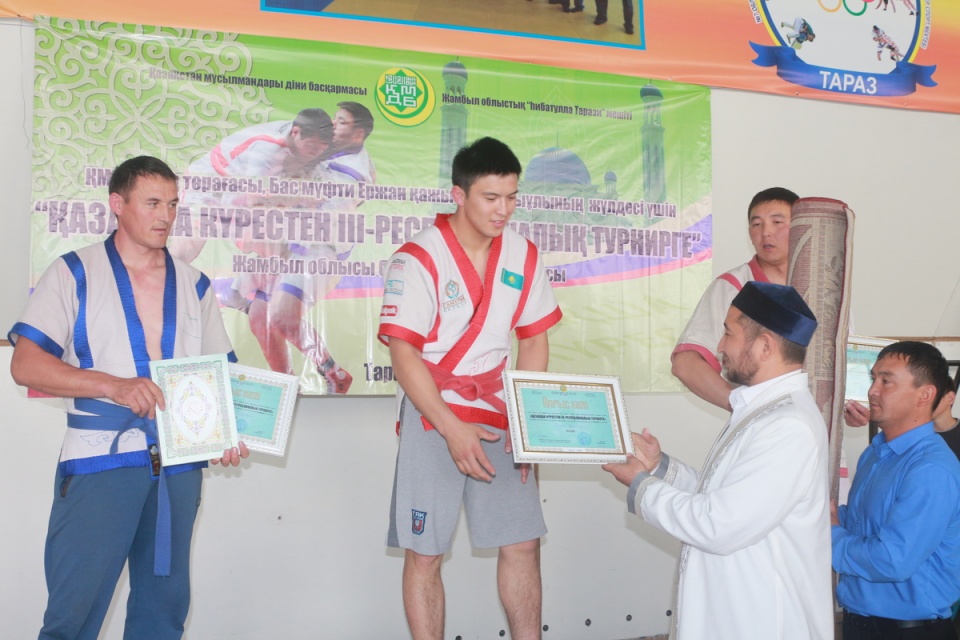 Жүлделі болған палуандарға ҚМДБ-ның Жамбыл облысы бойынша өкілі Данияр қажы Жұмабаев бағалы сыйлықтар мен мадақтама грамоталарын табыстады. 1 орынға кілім сыйға тартылса, 2,3 орынға Алланың кәләмі Құран Кәрім берілді.