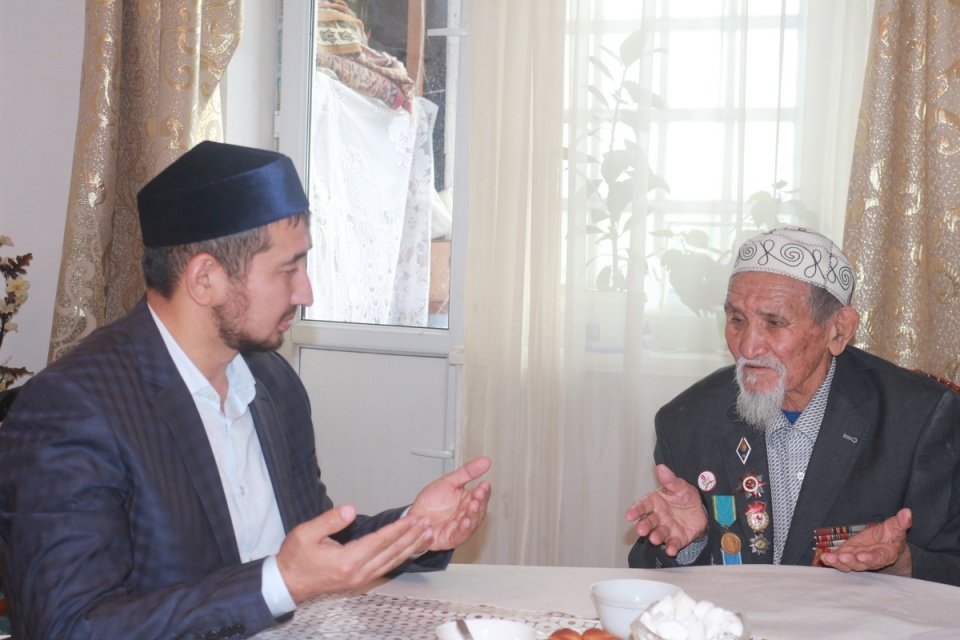 Осыған орай, ҚМДБ-ның Жамбыл облысы бойынша өкілі Данияр қажы Жұмабаев пен «Һибатулла Тарази» мешітінің қызметкерлері соғыс ардагерлері 95 жастағы ақын Мусахан Бердибаев пен 90 жастағы жазушы Муталип Ережепбаймен кездесіп қайтты.
