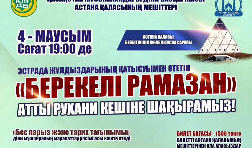 Қасиетті Рамазан қарсаңында ҚМДБ-ның бастамасымен 4-маусым күні Астана мешіттерінің ұйымдастыруымен «Бейбітшілік және келісім» сарайында «Берекелі Рамазан» атты рухани кеш өтеді. Ұлық айдың құрметіне орай ұйымдастырылып отырған кеште Елорда жұртшылығы үшін рухани-тағылымдық дүниелер ұсынылып, ораза нығметтері жайлы арнайы бейнебаяндар көрсетіледі. Белгілі айтыскер ақын Аманжол Әлтаев ағамыз жырдан шашу шашып, Құрмаш Маханов, Бейбіт Құшқалиев, «Nomad» және «Серпер» топтары, Қанат Полатбек сынды эстрада жұлдыздарының әнімен әрлене түсетін рухани кеште бұдан басқа тағылымды бағдарламалар қарастырылған.+