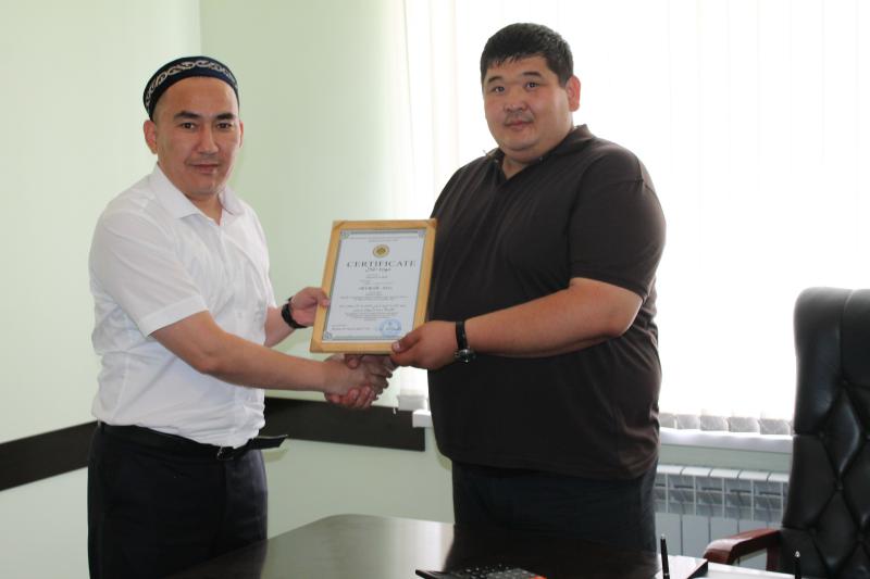 Аталмыш өндіріс орнымен жетік танысқан «Халал өнімдерді сертификациялау» бөлімінің ОҚО бойынша жетекшісі Бақдаулет Абдірахманов арнайы ҚМДБ сертификатын табыс етті.