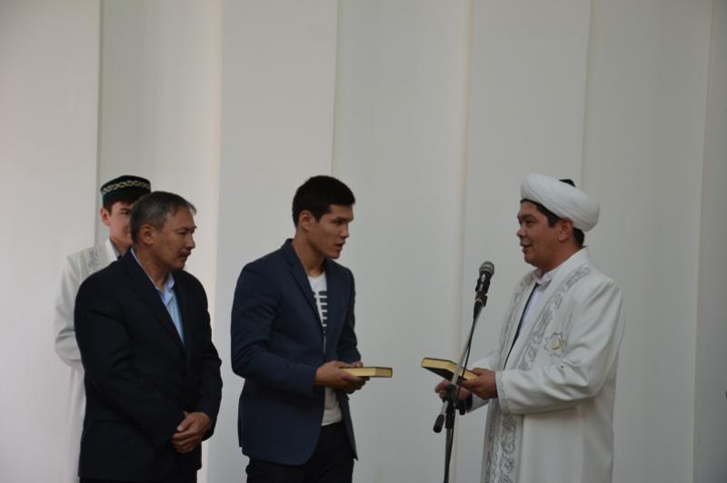 Өкіл имам ҚМДБ төрағасы, Бас мүфти Ержан қажы Малғажыұлы атынан Данияр Елеусіновке, әкесі Марат Елеусіновке қасиетті Құран кітабын табыстады.