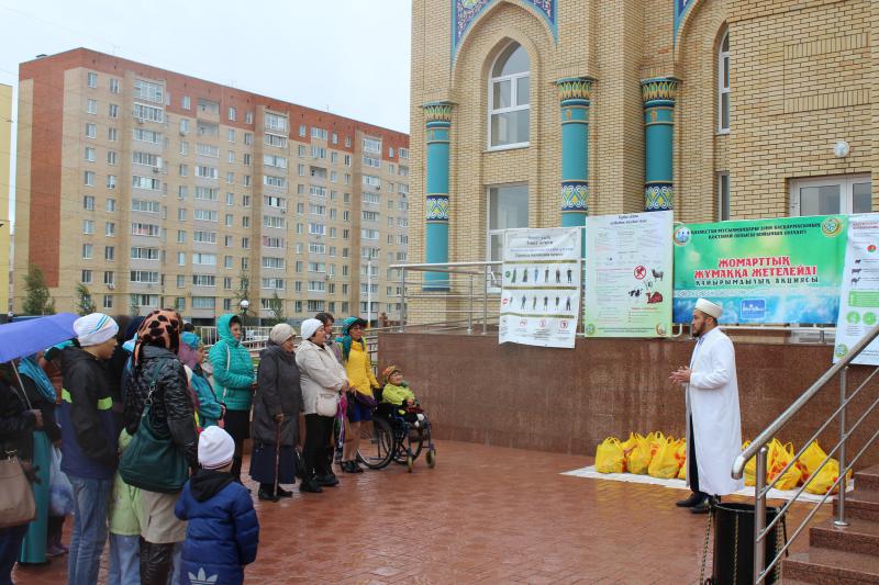 Айттың алғашқы екі күнінде құрбандыққа мал шалған кісілердің тілегі ескеріліп, сойылған малдың үштен бір бөлігі Қазақстан мұсылмандары діни басқармасының тапсырмасы негізінде Қостанай қалалық әкімдігі халықты жұмыспен қамту және әлеуметтік бағдарламалар бөлімі ұсынған тізім бойынша, Бахытбек Нұрғабылұлының басшылығымен мүгедектерге, күн-көрісі төмен, көп балалы отбасыларына таратып берді.