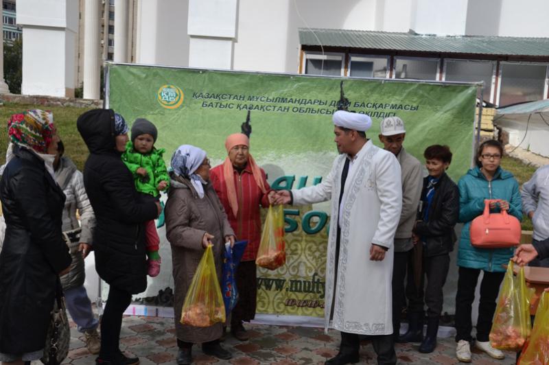 Ұлық күнде құрбан малын шалған ағайындар еттерін ағайын-туыс, көрші-көлемге, тұрмысы төмен отбасыларына, жетім-жесірлерге, мүгедектер мен сырқат жандарға таратады. Осыған байланысты Орал қаласы облыстық орталық мешітінің ұйымдастыруымен "Арнау-Батыс" мүгедек қоғамдық бірлестігіне, "Көшім" балалал психоневрологиялық медициналық-әлеуметтік мекемесіне, "Бәйтерек" мүгедек балалар үйіне, "Арба" тірек-қозғалыс аппаратының қызметтің бұзылған мүгедек орталығы мекемесіне, тұрмысы төмен отбасыларына, жетім-жесірлерге, сырқат жандарға құрбан еттері таратылды. Қайырымдылық шарасына облысқа қарасты барлық мешіттер мен облыстық Жастар ісі бөлімі мен «Әйелдер-қыздар» секторы бөлімінің мамандары атсалысты.