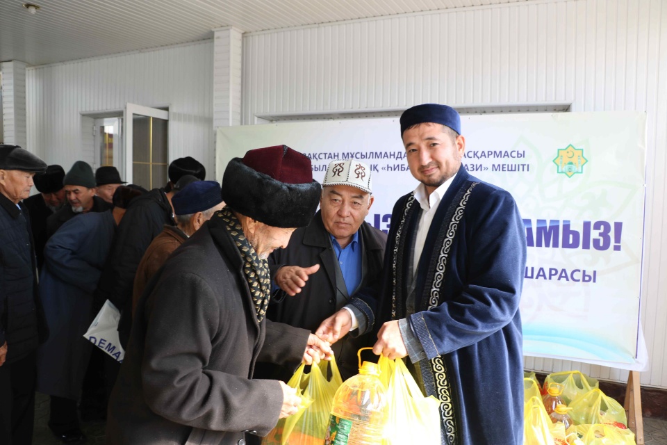 ҚМДБ-ның Жамбыл облысы бойынша өкілі «Һибатулла Тарази» мешітінің бас имамы Данияр қажы Жұмабаев, қалалық «Кеңесхан қажы» мешітінің бас имамы Ғазиз Ахметов және мешіт қызметкерлері қатысқан отырыста 15 ақсақалға азық-түлік жеткізілді. Имамдар әсерлі уағызын жеткізсе, талапты жастар діни термесін төкпеледі.