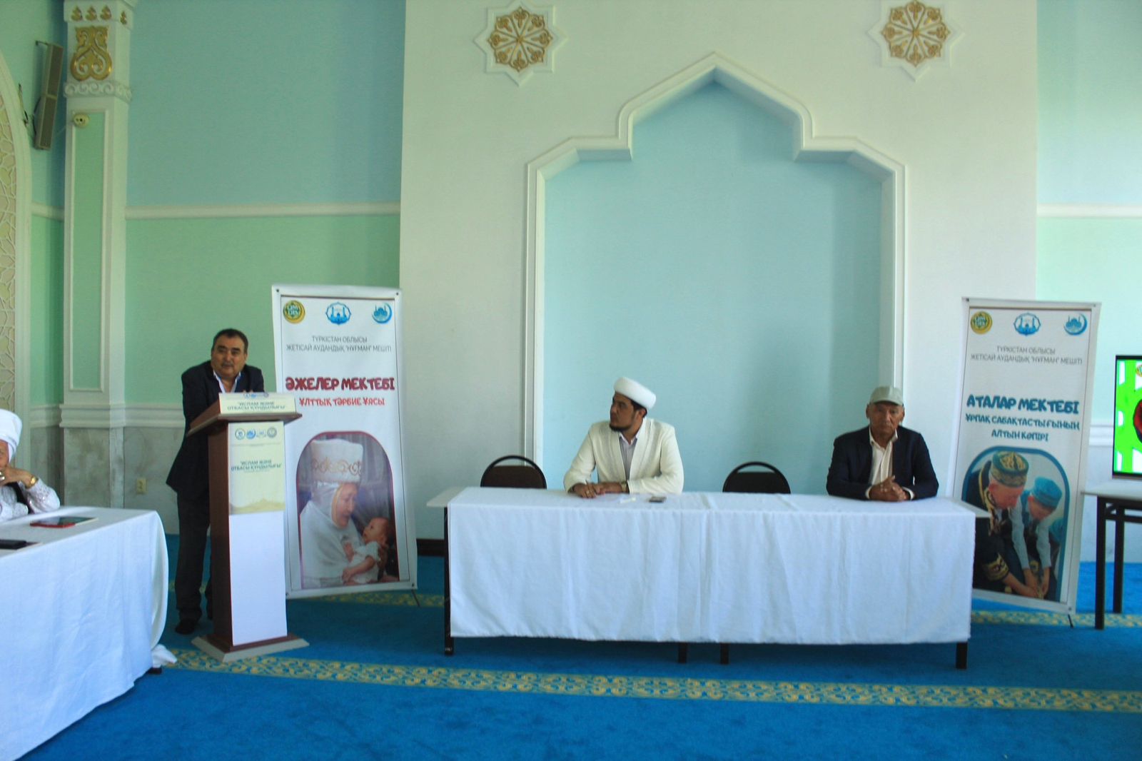 Жиынды Жетісай ауданының Бас имамы Бағдат Шаймерден ашып, «Аталар мектебі – ұрпақ сабақтастығының алтын көпірі», «Әжелер мектебі – ұлттық тәрбие ұясы» тақырыптарында баяндама жасады. Ол өз сөзінде аталар мен әжелер мектебінің жас ұрпақ тәрбиесіндегі маңызы зор екенін атап өтті.
