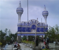 Мұндай түстерді қолдану ойға келмеген жайт болды. Архитекторлар жәннат зәулім үйлерін еске түсіретін мешіт соғуды жоспарлаған. Биік қақпалар мешіттің бас есігі. Олар күлгін конус күмбезбен безендірілген. Мешіттің бас ғимараты мен оның қақпасында көк-ақ түсті араб грамматикасы жазылған.