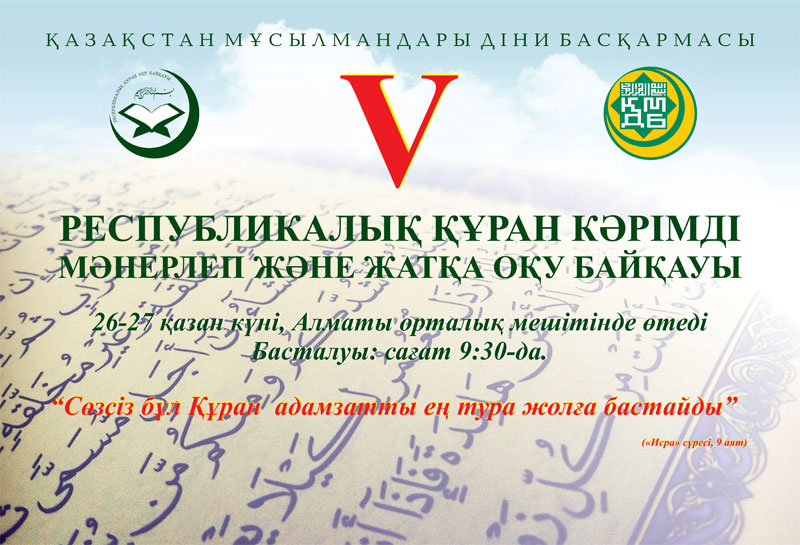 Қазақстан мұсылмандары діни басқармасы қасиетті Құран Кәрімді мәнерлеп және жатқа оқудан байқау ұйымдастырғаны белгілі. Қарилар арасында өткен жарыстың қорытындысы Алматыдағы Студенттер сарайында жарияланатынын хабарлаймыз. Рухани кеште жүзден жүйрік шыққандар ақшалай, бағалы сыйлықтармен және алғыс хаттармен марапатталады. Игі шараға Бас мүфти Ержан қажы Малғажыұлы бастаған ҚМДБ қызметкерлері, зиялы қауым өкілдері, ақын-жазушылар, журналистер қауымы қатысады.