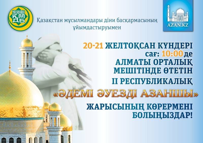Қазақстан мұсылмандары діни басқармасының ұйымдастыруымен 20-21 желтоқсан күндері, Алматы орталық мешітінде ІІ-ші Республикалық "Әдемі әуезді азаншы" атты жарысы өтеді.