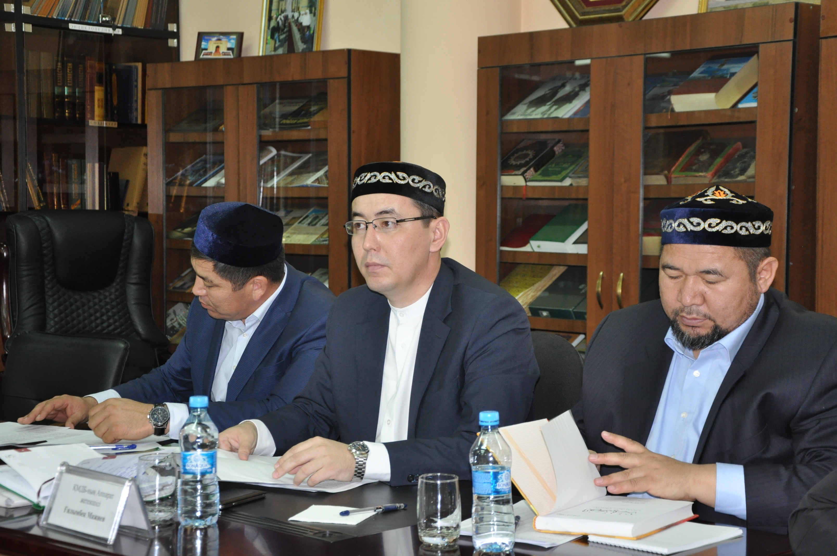 Қауымдастық қызметкерлерінің білім деңгейін ҚМДБ-ның аппарат басшысы Ғылымбек Жәдігерұлы, Шариғат және пәтуа бөлімі меңгерушісінің орынбасары Сансызбай Құрбанұлы, Дін істері бөлімінің меңгерушісі Камалжан Бекбосынұлы, оқу-ағарту бөлімінің меңгерушісі Бақтыбай Бейсенбаев, Маңғыстау облысы бойынша өкіл имам Смайыл Сейітбеков және Ерсін Әмірe сараптамадан өткізуде.