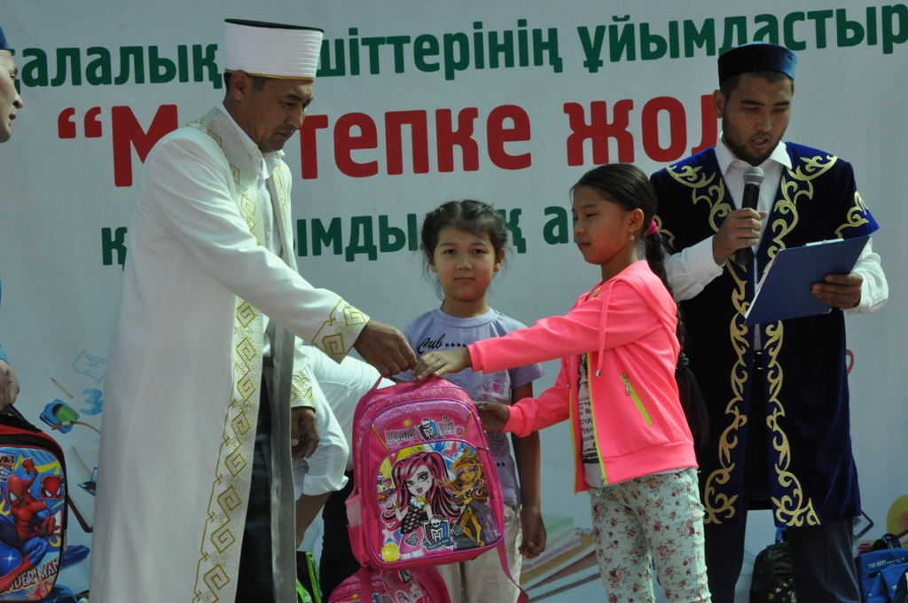 «Ұйымдастырылып жатқан іс шараның басты мақсаты аз қамтамасыз етілген отбасылар мен көпбалалы отбасылардан шыққан балаларға мектепке барар кезінде киім-кешек, аяқ-киім, кеңсе тауарлары, оқу құралдарымен қамтамасыз етіп демеу жасау. Бұл «Мектепке жол» акциясы республика бойынша әр мешітте жыл сайын ұйымдастырылып келеді. Тек Алматы қаласы бойынша кеше «Алғабас» мешітінде 150 оқушыға мектеп формасы мен қажетті заттар табысталды. Бұл шара еліміздің барлық аймақтарында алдағы уақытта да жалғасын табатын болады», – деді Бас мүфти Ержан қажы Малғажыұлы.