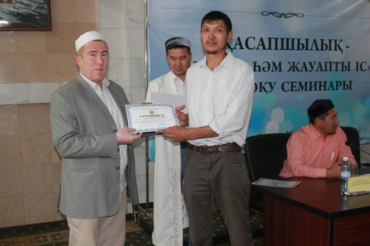 ҚМДБ "Шариғат және пәтуа" бөлімінің меңгерушісі, наиб мүфти Мұхаммед Хусейн Алсабеков семинардың маңыздылығына тоқтала отырып, ізгі тілегін айта келе, қасапшыларға ҚМДБ «Халал өнімдерін стандарттау» бөлімі дайындаған әр қасапшыға жеке мөр, куәлік және Сертификат тапсырды.