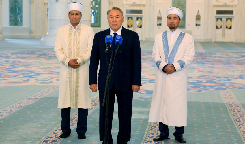 Астанада "Әзірет Сұлтан" мешітіне таңғы намаз аяқталған бойда келген Қазақстан Президенті Нұрсұлтан Назарбаев сәждеге жығылғаннан кейін мұсылман қауымына құттықтау тілегін жеткізді.