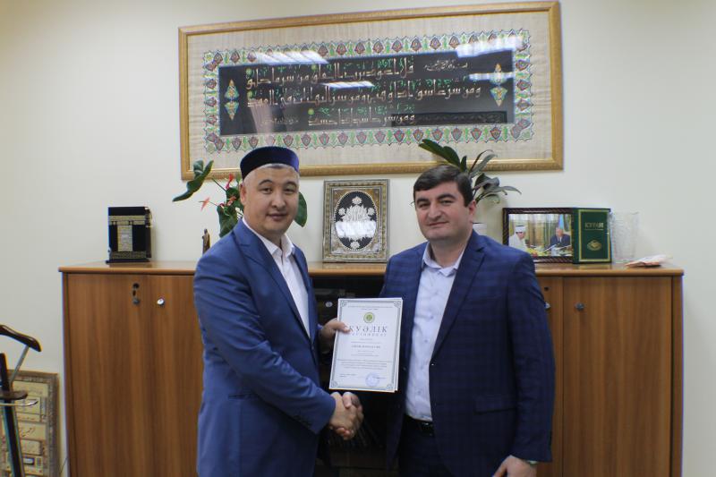 Халал сертификатын Алматы қаласы орталық мешітінің Бас имамы Нұрбек қажы Есмағанбет табыстады.