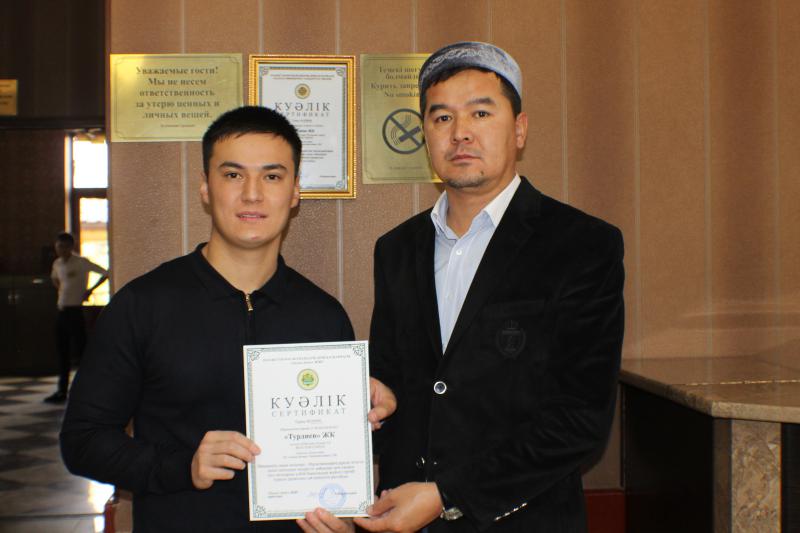 Шариғат талаптарына сай әлемдік стандарттарға толық жауап бере алатын қонақ үйге сертификатты "Халал өнімдерін стандарттау" бөлімі меңгерушісінің орынбасары Ануар Ізімбайұлы табыстады.