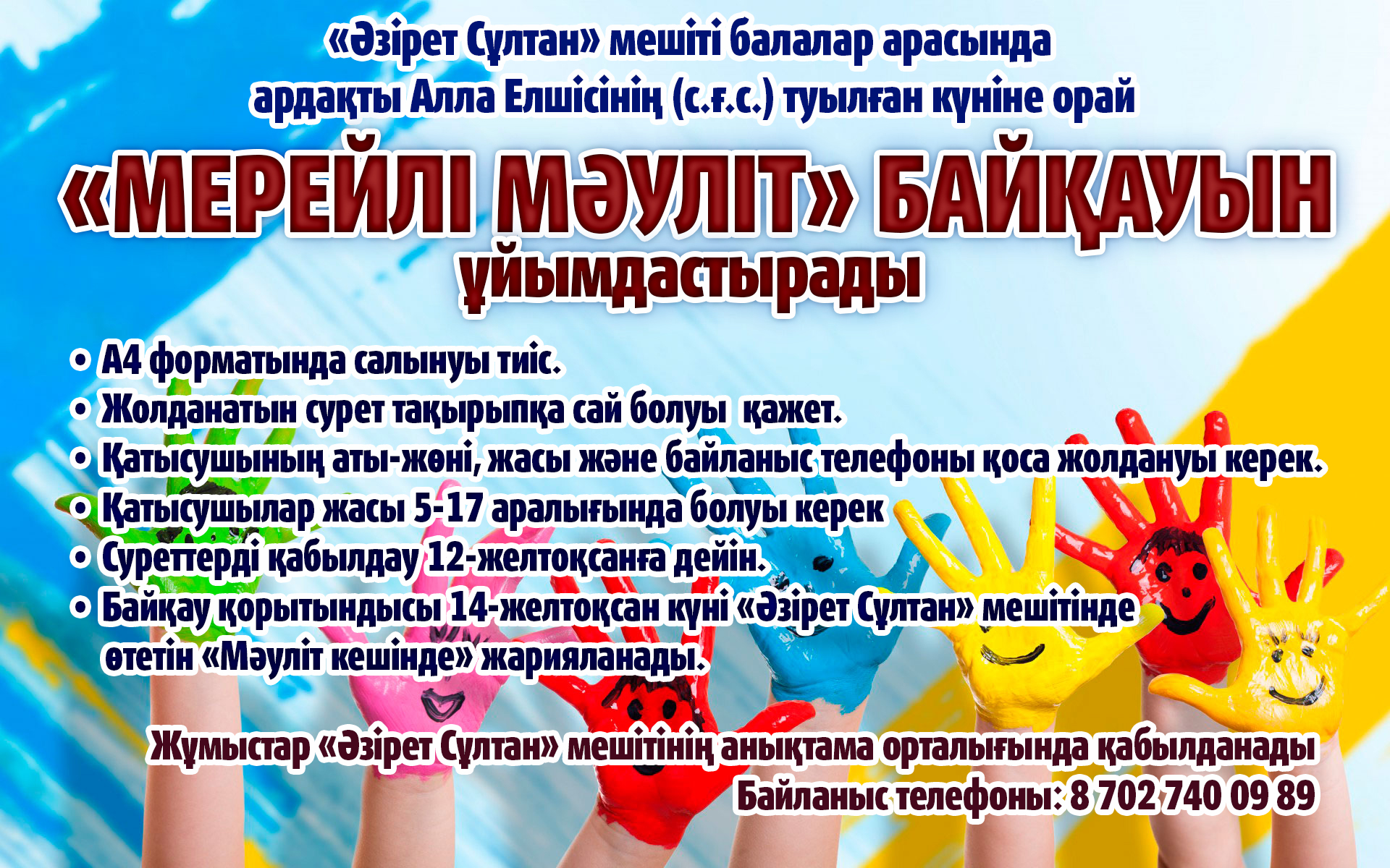 «Әзірет Сұлтан» мешіті ардақты Алла Елшісінің (ﷺ) туылған күніне орай балалар арасында «МЕРЕЙЛІ МӘУЛІТ» атты сурет байқауын жариялап отыр.