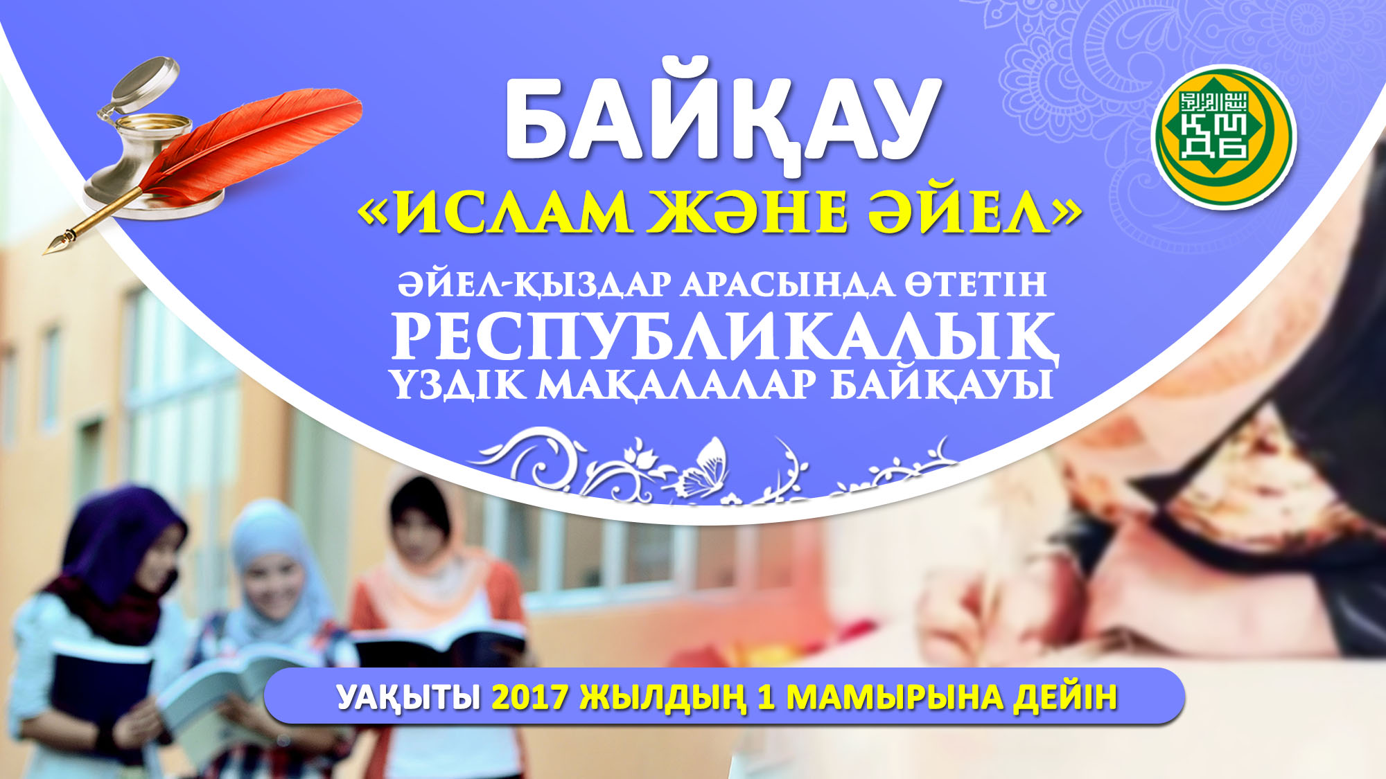 Елін, жерін, отанын сүйетін, елжанды, иманды патриот ұрпақ тәрбиелеу үшін ҚМДБ-ның Жалпы және жастар ісі бөлімі «Әйелдер-қыздар» секторы жалпы жамағат арасындағы әйел-қыздарға арналған «Ислам және әйел» атты Республикалық ғылыми, діни-танымдық мақалалар байқауын ұйымдастырады! Мақала жазудың шарттары төмендегідей: