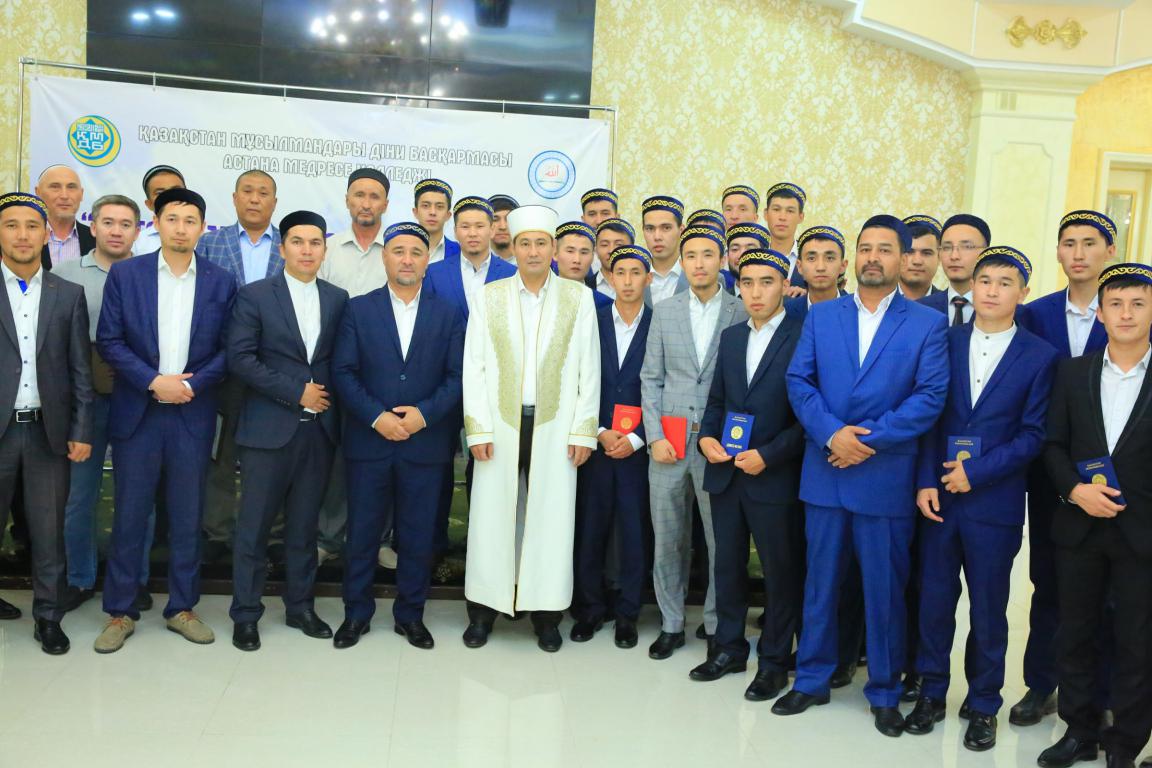 Қазақстан мұсылмандары діни басқармасының төрағасы Ержан қажы Малғажыұлы «Астана» медресесін аяқтаған біртоп шәкіртке диплом табыстап, болашақ имамдар мен ғалымдарға сәттілік тіледі.
