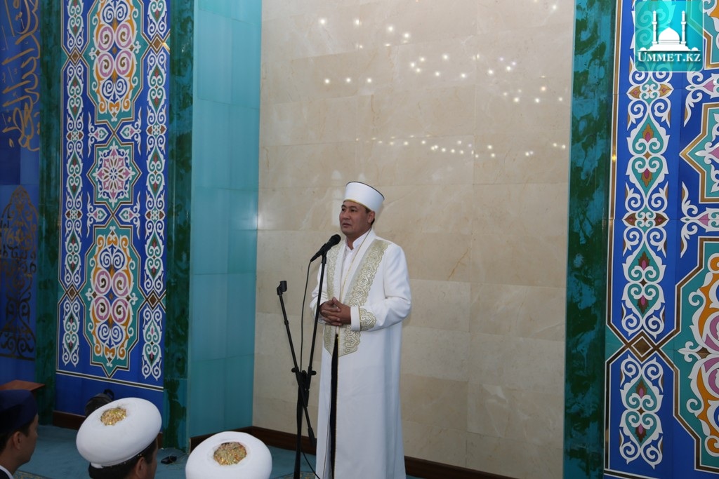 Сөз барысында Бас мүфти: «Қасиетті Рамазан айының аяқталғанын білдіретін Ораза айт – мейірімділіктің, игіліктің, бірліктің, ізеттіліктің, қайырымдылықтың мерекесі. Бұл мейрам барша халықты ізгілікке ұйытады. Ораза айт – бір ай бойы ораза ұстап, ықыласпен жақсылық жасаған адамның құрметке, марапатқа ие болатын кезі. Алла Тағала баршамызды мол сауапқа кенелген құлдарының қатарына қосуын тілеймін. Барша отандастарымды Ораза айттың құрметі үшін бір-бірімізді кешіріп, әуелі Алланың, ата-анамыздың құрметі мен ризалығына бөленуге шақырамын. Алла Тағала ұстаған оразаларымызды, дұға-тілектерімізді қабыл еткей! Я, Алла, бізді осы күнге жеткізгеніне шүкір. Бүгінгі дұға, тілектерімізді Өзің қабыл ете гөр! Өзіңнің разылығың үшін ізгі амалдар жасауға мүмкіндік бергеніңе шүкір! Елімізге тыныштық, татулығымызды нығайта гөр» деп дұға жасады.