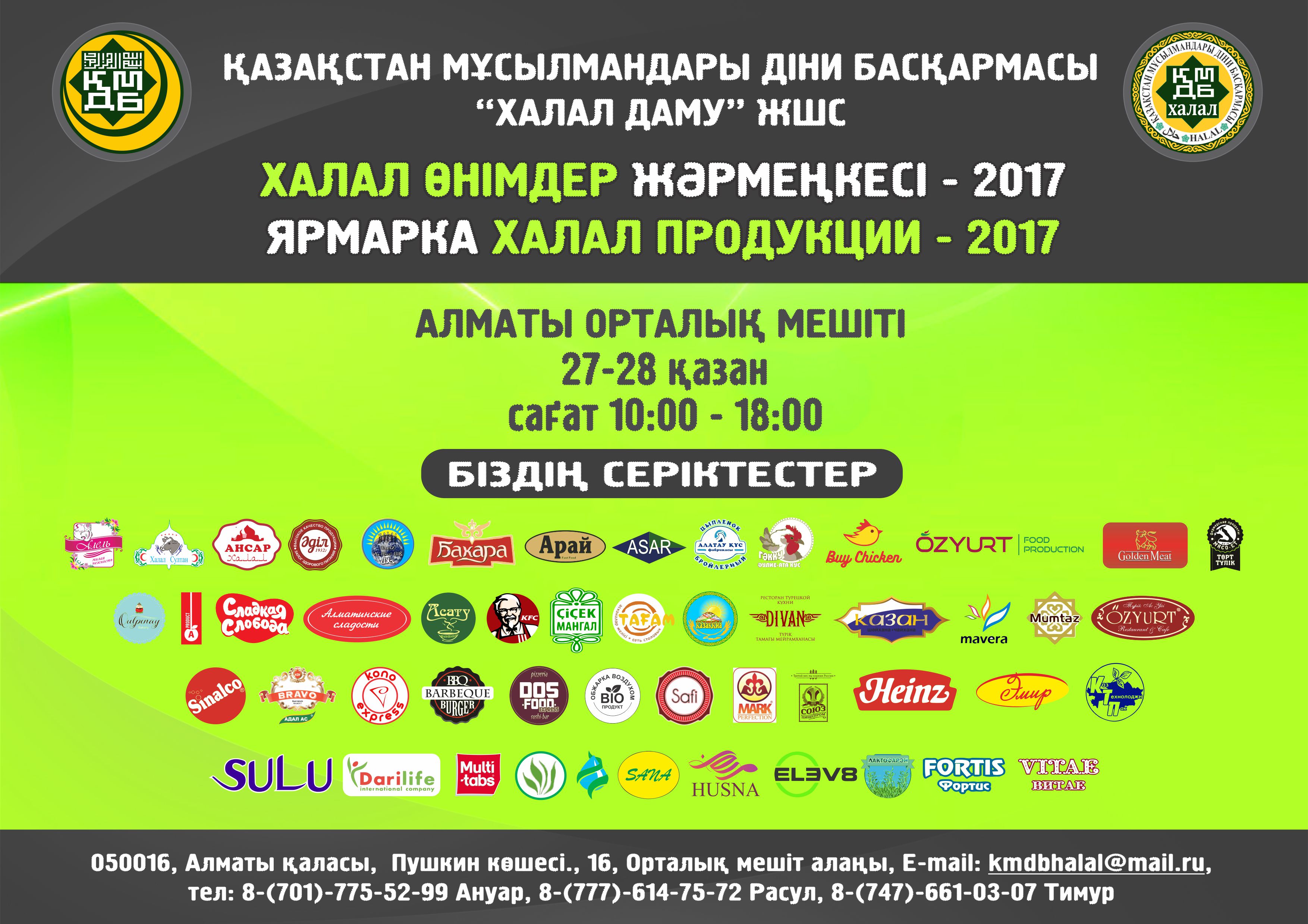 ҚМДБ, «Халал Даму» ЖШС сіздерді «Халал өнімдер жәрмеңкесі-2017» атты кезекті жәрмеңкесіне шақырады. Өтетін орны 2017 жылы қазан айының 27-28 жұлдызында, Алматы қаласы, Пушкин көшесі, 16 мекен-жайы бойынша, Орталық мешіттің алаңында, сағат 10:00-ден 18:00-ге дейін өтеді.