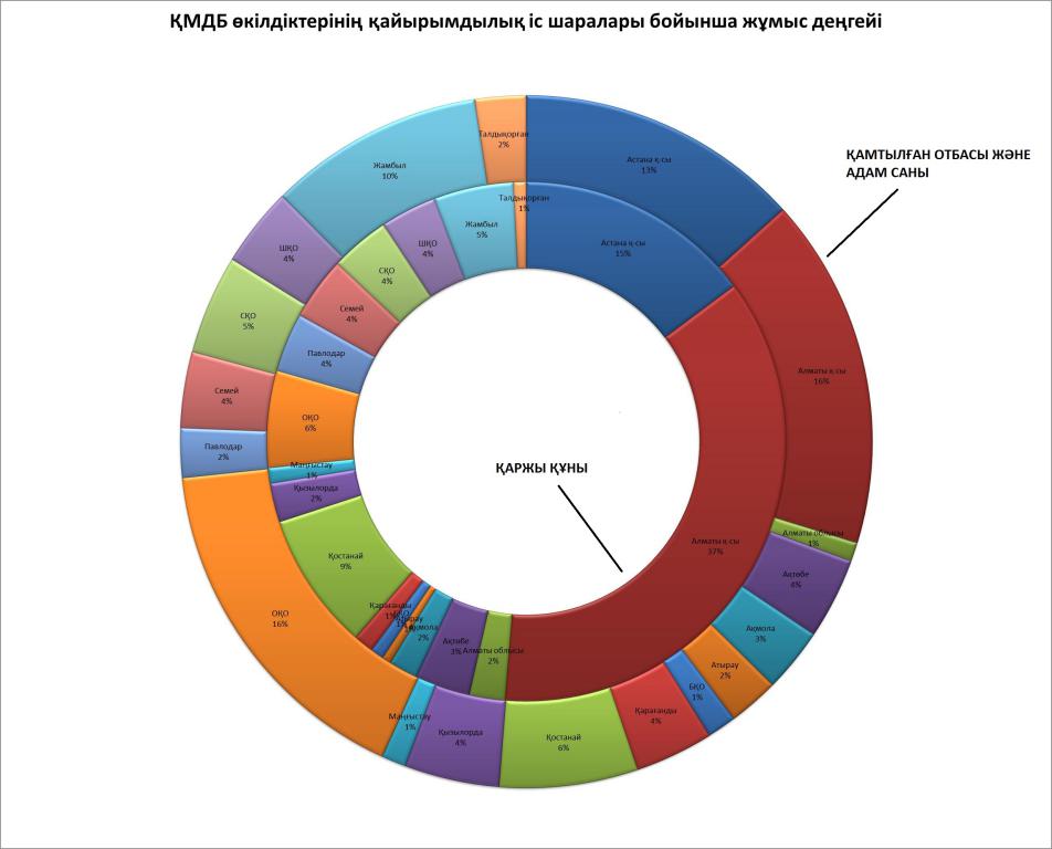 Діни басқарма жыл сайын «Қайырымдылық керуені», «Мектепке жол», «Бауырыңа өмір сыйла», «Рамазан сыйлығы», «Қарттарға қамқорлық», «Жетім көрсең, жебей жүр», «Мұқтаждың мұңын бөліс» «Сен де үлес қос» деген атаумен жүйелі түрде қайырымдылық шараларын жүзеге асырып келеді. Соңғы 2 жылдың көлемінде дін қызметкерлері 10-нан астам тұрмысы төмен отбасыға үй салып беруге үлес қосты. Тек бір ғана қасиетті Рамазан айында еліміз бойынша жыл сайын 70 мыңнан астам отбасыға пітір садақасы есебінен материалдық көмек көрсетіледі. Облыстық мешіт жанынан тегін киім-кешек, азық түлік дүкендері ашылды.