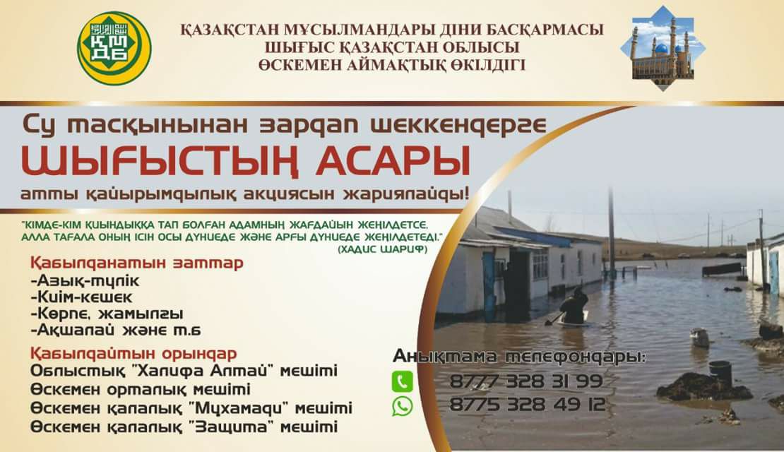 Бас мүфти Серікбай қажы Ораз облыс имамдарына су тасқынынан зардап шеккен шығыстағы ағайынға көмек көрсетуді тапсырды. Бүгін мүфтият деңгейінде "Қайырымдылық керуені" атты акция басталды.