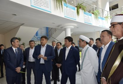 Оқу кешенімен танысқан соң министр мен қала әкімін Алматы Орталық мешітінің бас имамы Еркінбек Шохаев пен Нұр-Мүбарак мешітінің бас имамы Қайрат Жолдыбай мырзалар күтіп алып, университетпен етене оқу-әдістемелік мешіттің тыныс-тіршілігімен таныстырды.