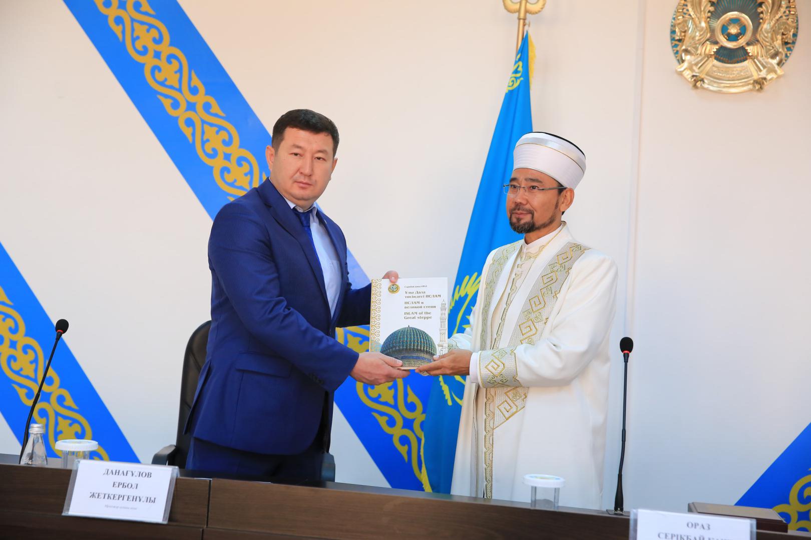 Сұхбат соңында ҚМДБ төрағасы аудан тұрғындарына " Ұлы дала төсіндегі Ислам" кітабын сыйға тартты.