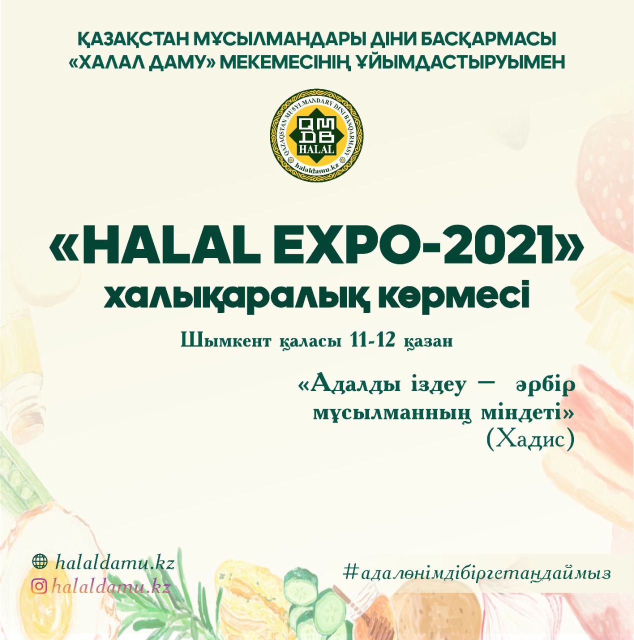 ҚМДБ Төрағасы, Бас мүфти Наурызбай қажы Тағанұлының бастамасымен 11-12 қазан күндері Шымкент қаласында «QMDB Halal» сертификатын алған өнімдердің халықаралық «HALAL EXPO 2021» көрмесі өтеді.