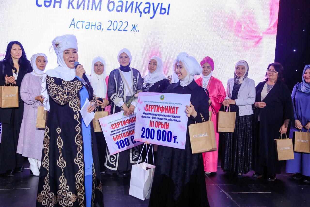 Бүгін Астана қаласында Қазақстан мұсылмандары діни басқармасы Әйел-қыздар секторының ұйымдастыруымен өткен ІІ республикалық мұсылман әйелдерінің «Әсем киім – әйел ажары» сән киім байқауының жеңімпаздары марапатталды.
