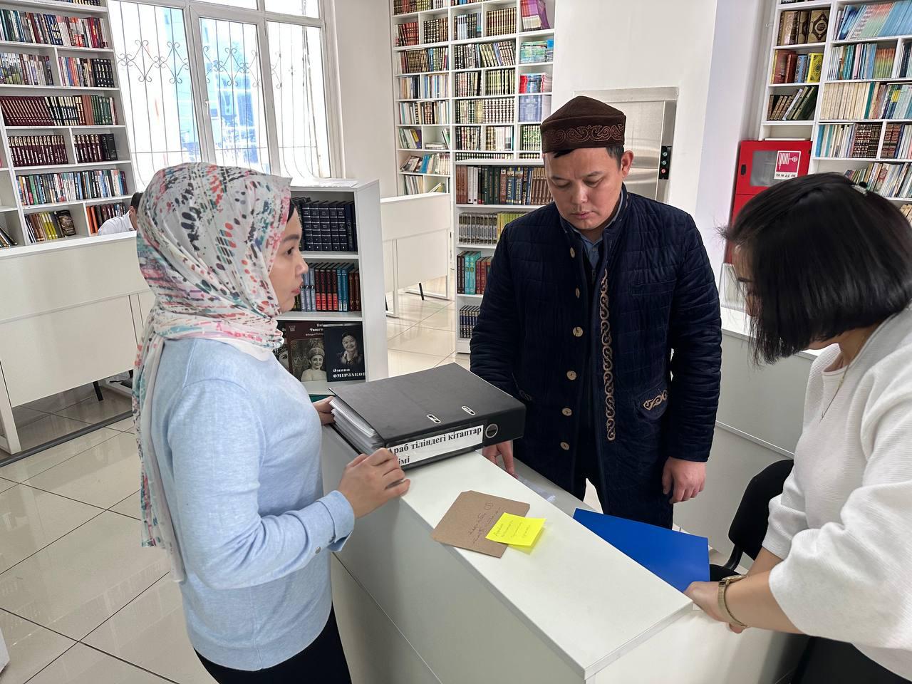 ҚМДБ төрағасы Наурызбай қажы Тағанұлының тапсырмасы аясында Діни сараптама бөлімінің Алматы қаласындағы жауапты өкілі Тимур Алиев өзге де мамандармен бірге «Нұр-Мүбарак» Ислам мәдениеті университетіне қарасты кітапханалар мен мешіттердегі діни әдебиеттерді тексерді.