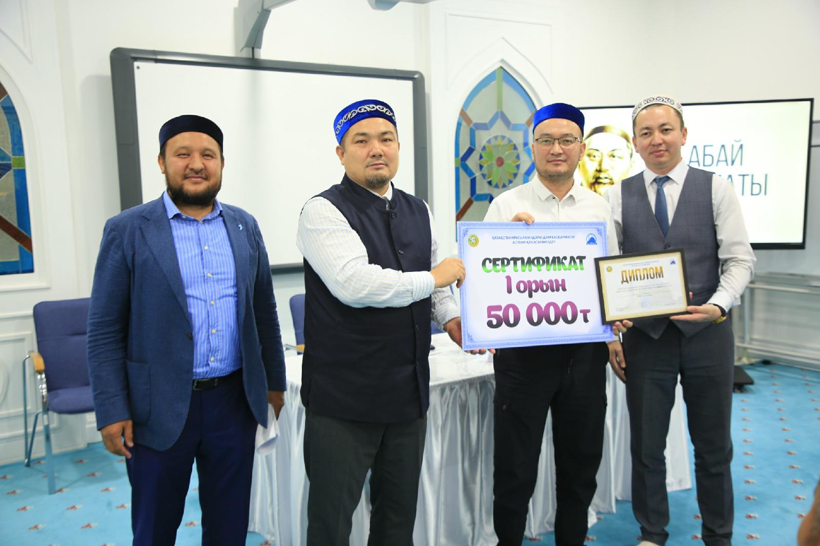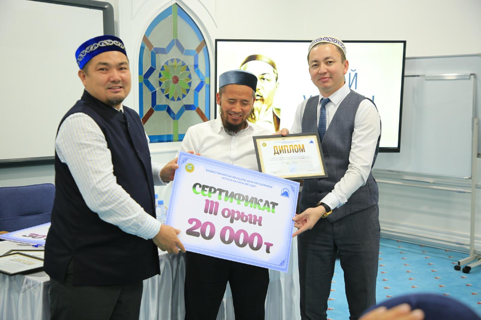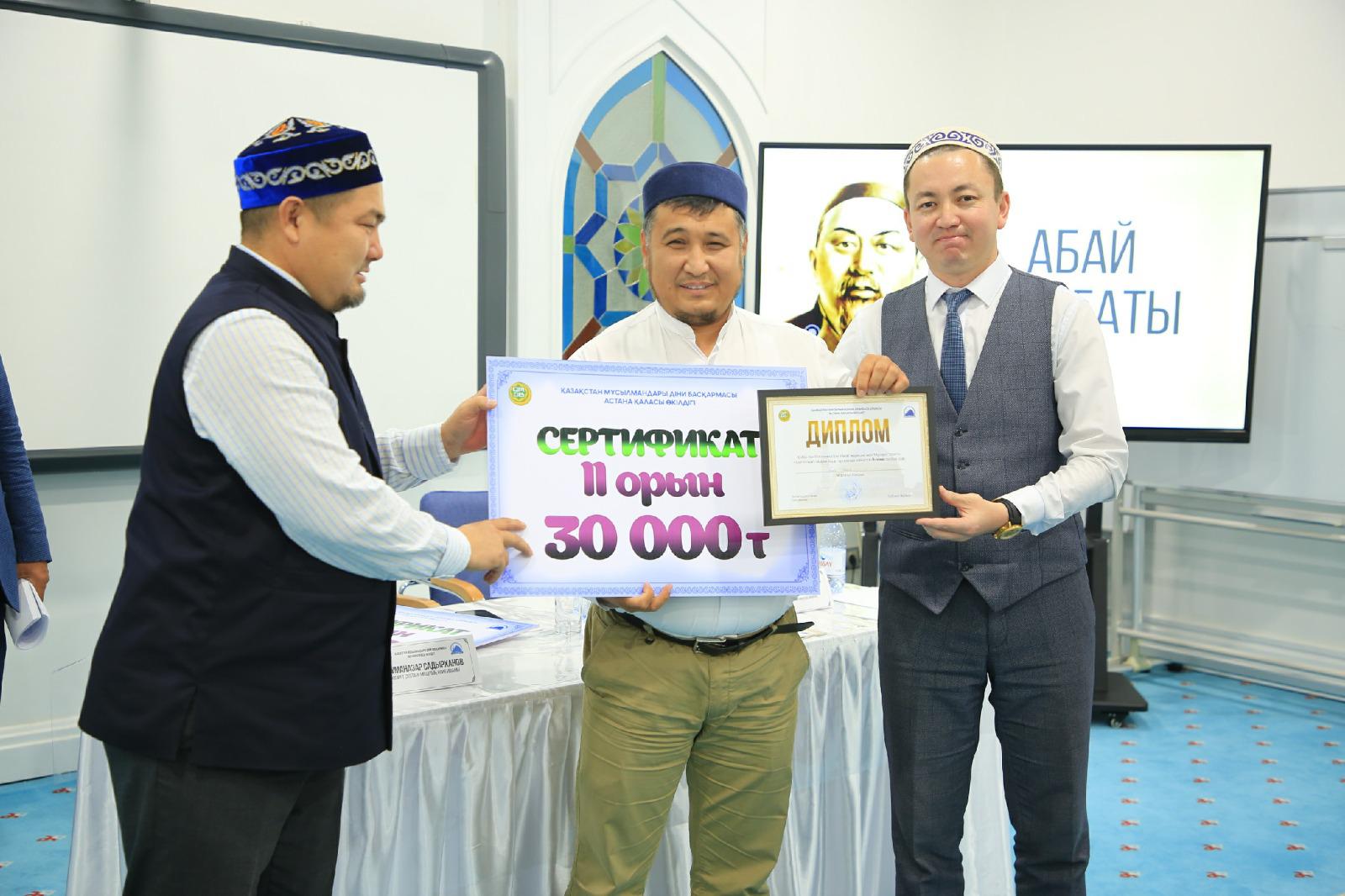 Қазылар алқасында төрелік еткен қала бас имамы Ерболат Нұрылдаұлы, «Әзірет Сұлтан» мешітінің наиб имамы Жұманазар Садырханұлы, «Muftiyat» баспасының маманы Әлішер Ерболатұлы жеңімпаздарды анықтап, оларға ақшалай сый-сияпаттар мен алғыс хаттарды табыстады.