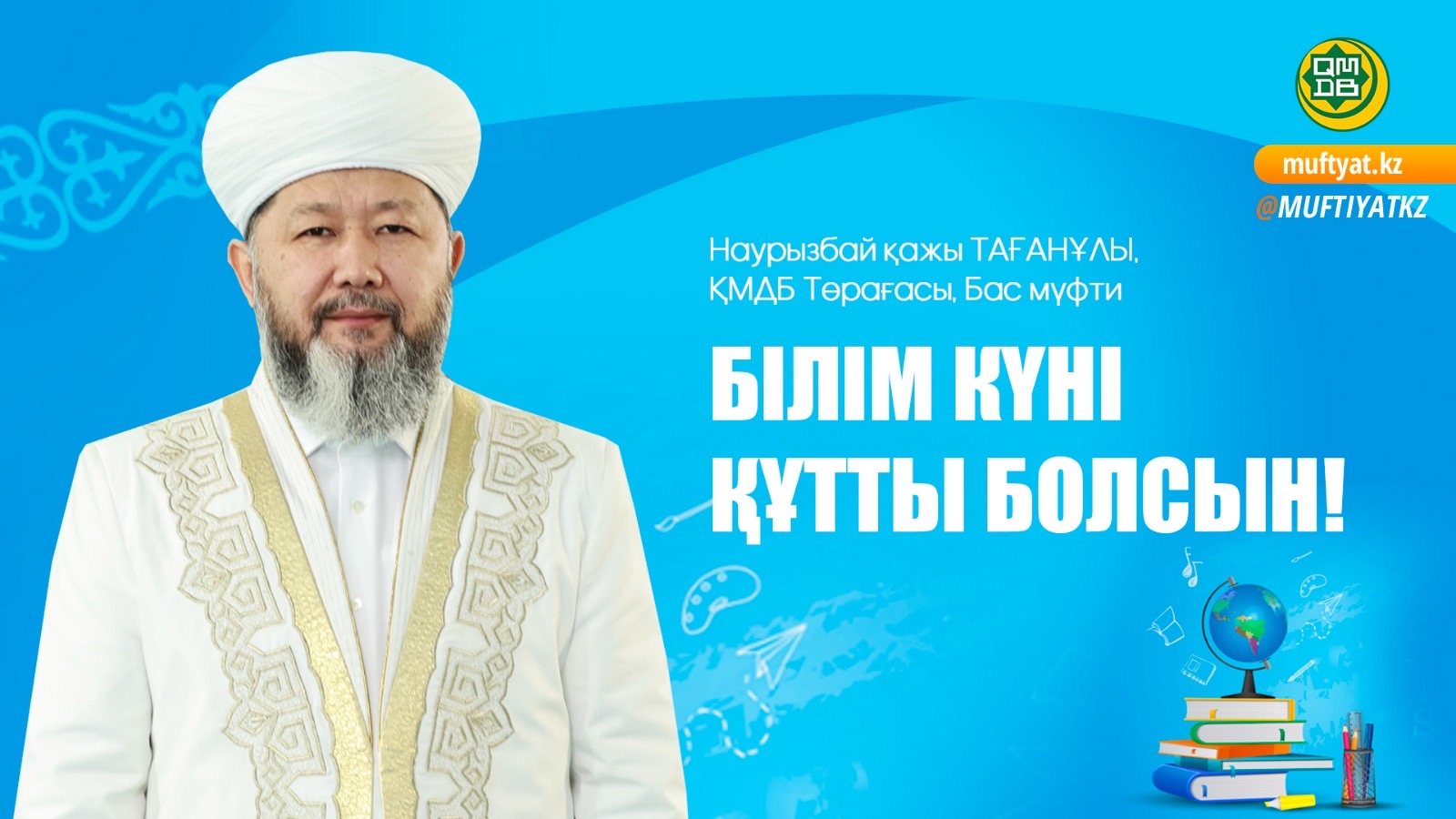 Білім жолындағы барша іні-қарындастарымды, мұғалімдер мен білім саласының қызметкерлерін, соның ішінде «Нұр-Мүбарак» университетінің, медресе-колледждердің ұстаздары мен шәкірттерін 1 қыркүйек – Білім күнімен шын жүректен құттықтаймын! Болашақтың іргесін қалайтын шәкірттерге жаңа оқу жылында табыс пен береке тілеймін!