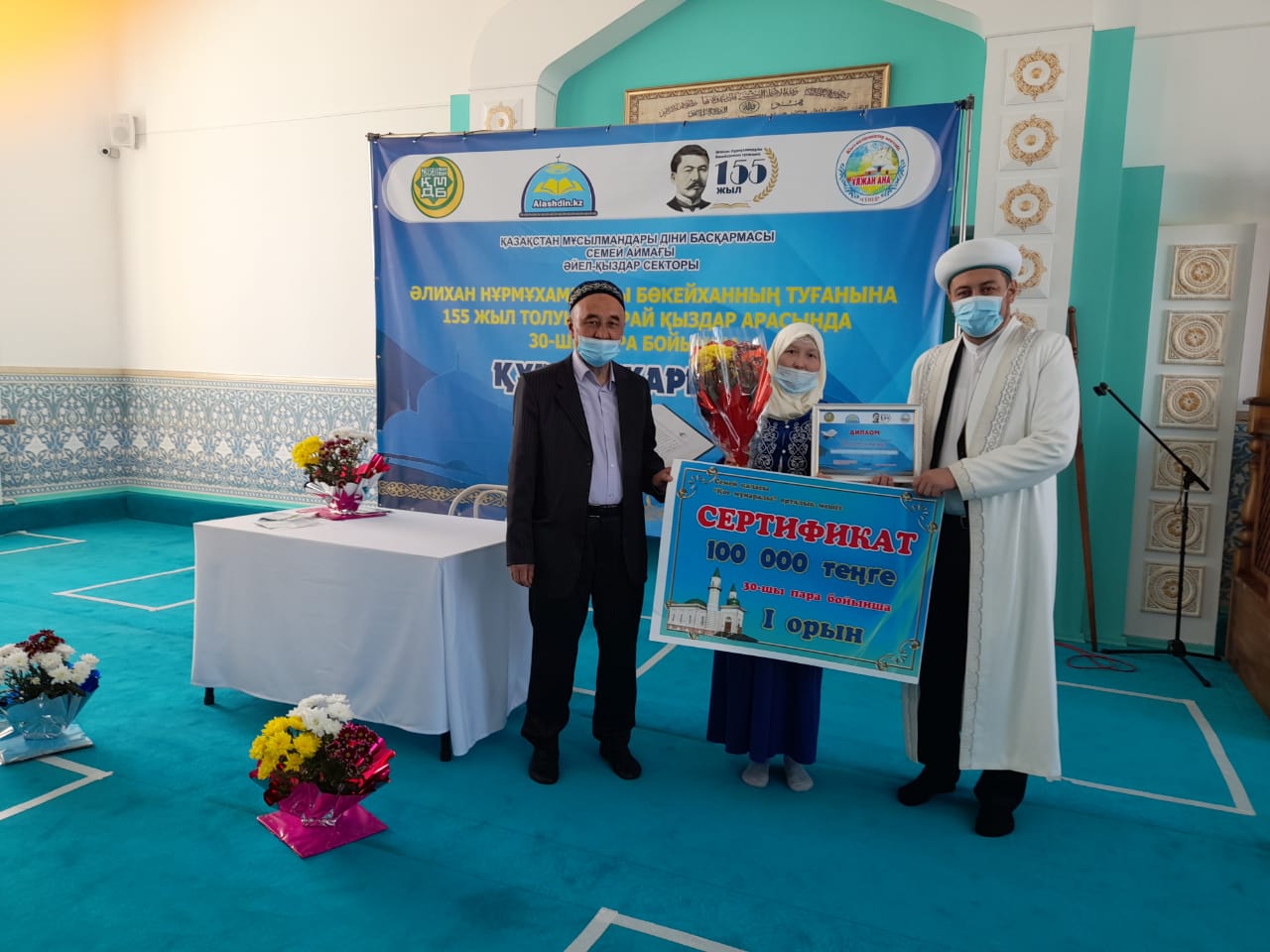 По итогам лучшие участницы были награждены призами. Главный имам Аскар Абитайулы поблагодарил всех конкурсанток и вручил денежные средства, специальные подарки и благодарственные письма. Также были вручены специальные призы и благодарственные письма самым юным участницам.