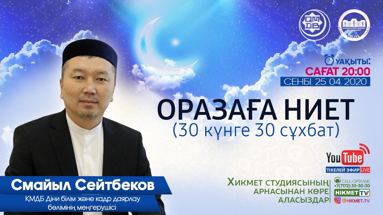 Сегодняшнюю онлайн-беседу на тему «Намерение на пост» продолжит Смаил Сейтбеков, начальник Отдела религиозного образования и подготовки кадров. Таким образом, онлайн-беседы будут проводиться тридцать дней. Трансляцию можно будет смотреть в прямом эфире каждый день в 20:00 по времени Нур-Султана на канале YouTube студии «Хикмет ТВ».