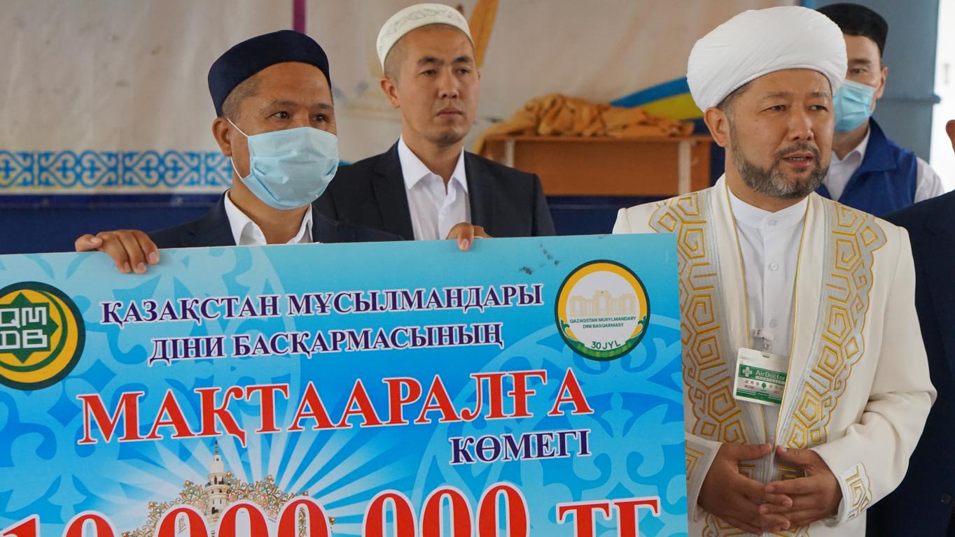 Верховный муфтий Наурызбай кажы Таганулы, прибывший сегодня в Мактааральский район Туркестанской области, вручил сертификат на сумму 10 миллионов тенге в помощь местному населению.