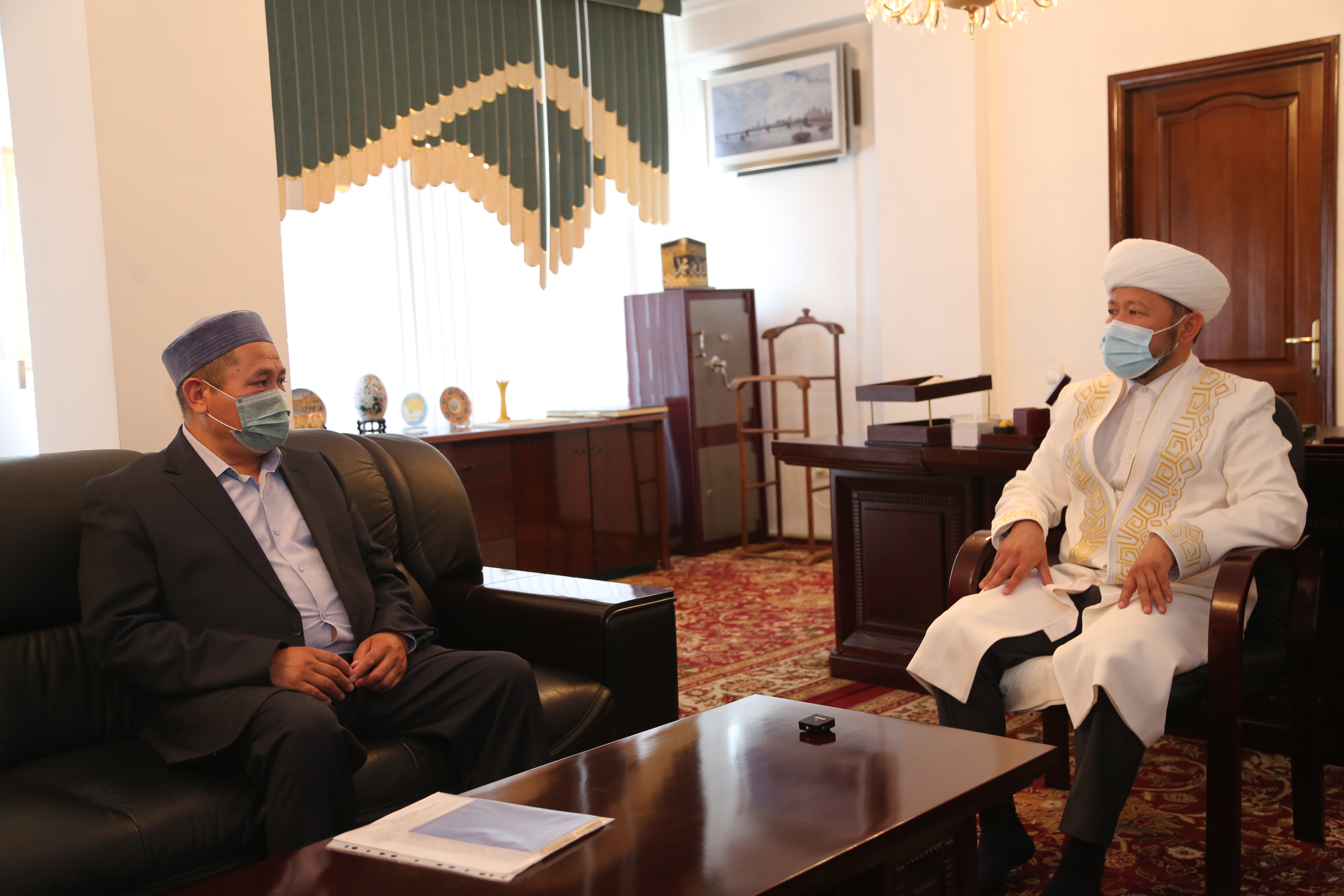 В ходе рабочей поездки в Алматы Председатель Духовного управления мусульман Казахстана, Верховный муфтий Наурызбай кажы Таганулы принял директора медресе-колледжа «Абу Ханифа» Кулмухаммеда кажы Маханбета.